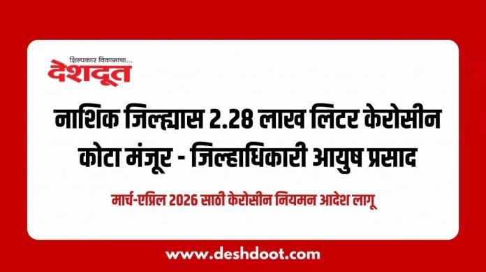 केंद्र शासनाने एलपीजी गॅस पुरवठ्यातील तुटवड्याच्या पार्श्वभूमीवर केरोसीनचा पर्यायी इंधन म्हणून मर्यादित वापर करण्यास मान्यता दिल्यानंतर, मार्च-एप्रिल २०२६ या कालावधीसाठी नाशिक जिल्ह्यास 2 लाख 28 हजार लिटर केरोसीन नियतन मंजूर करण्यात आले आहे. या संदर्भातील सविस्तर आदेश जिल्हाधिकारी आयुष प्रसाद यांनी जारी केले असून, जिल्ह्यातील सर्व संबंधित यंत्रणांना त्याची काटेकोर अंमलबजावणी करण्याच्या सूचना देण्यात आल्या आहेत.