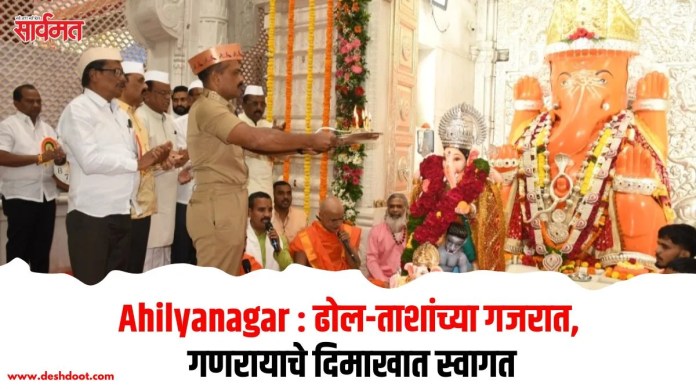 गणपती बाप्पा मोरयाच्या गजरात आणि ढोल-ताशांच्या दणदणाटात बुधवारी अहिल्यानगर शहरात गणरायाचे आगमन झाले. घरोघरी तसेच सार्वजनिक मंडळांनी मोठ्या उत्साहात गणेशमूर्तीची प्रतिष्ठापना करून दहा दिवसांच्या गणेशोत्सवाला प्रारंभ झाला. शहराचे ग्रामदैवत असलेल्या श्री विशाल गणेश मंदिरात जिल्हा पोलीस अधीक्षक सोमनाथ घार्गे यांच्या हस्ते श्रींची प्राणप्रतिष्ठापना विधिवत पार पडली. या वेळी रूद्रवंश ढोल पथकाच्या गजराने परिसर उत्साहाने दुमदुमला. तर भिंगारमध्ये मानाच्या देशमुख वाडा गणपतीची प्रतिष्ठापना झाली.