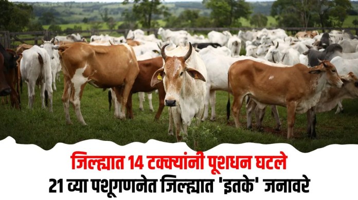 नगरसह राज्यात २५ नोव्हेंबर २०२४ ते मार्च २०२५ या कालावधीत करण्यात आलेल्या २१ व्या पशुगणननेचा अहवाल येणे बाकी असले तरी यात प्राथमिक स्तरावर जिल्ह्यातील पशूधनात २० व्या पशूगणेच्या तुलनेत १४ टक्क्यांची घट आली आहे. २०१९ ला झालेल्या २० व्या पशूगणनेत जिल्ह्यात ३० लाख ७८ हजार ४३० विविध पशूधन होते. ते २०२५ च्या पशूगणेत २६ लाख ६८ हजार ६४० पर्यंत खाली आहे.