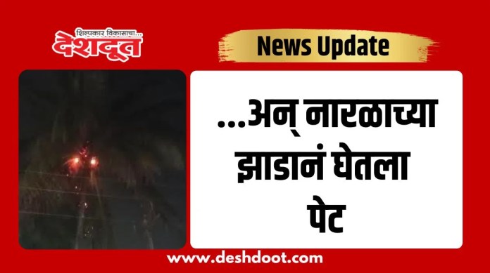लॅमरोड बालगृह रोड वरील गंगासागर किराणा दुकानासमोरील अनुराधा स्टेट बँक काॅलनीत सायंकाळच्या सुमारास नाराळाच्या झाडवर फटाका-राॅकेट पडल्याने झाडाने पेट घेतला, झाड उंच असल्याने आगीच्या ठिणग्याग्या खाली पडत असल्याचे नागरिकांच्या लक्षात येताच कॅन्टाेन्मेन्ट बोर्डाच्या अग्निशमन दलाशी संपर्क साधुन माहिती दिली.