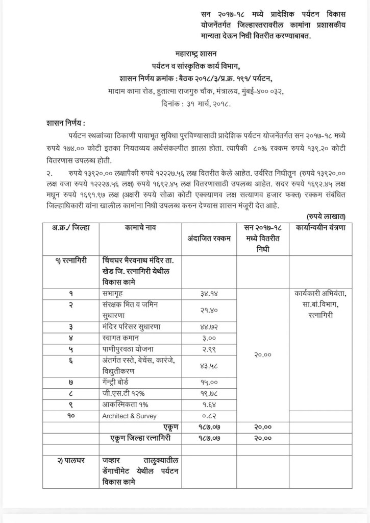 मिळालेल्या माहितीनुसार, २०१८ साली भाजप-शिवसेनेच्या महायुती सरकारने (Mahayuti Government) अशोक खरातच्या ईशान्येश्वर मंदिरासाठी दीड कोटींचा निधी मंजूर केला होता. त्या निधी संदर्भातील २०१८ चा शासन आदेश असून, तत्कालीन पर्यटन मंत्री जयकुमार रावल यांच्याकडून १०५ कोटींचा रुपयांचा निधी मंजूर करण्यात आला होता. ३१ मार्च २०१८ रोजी ईशान्येश्वर मंदिरासाठी हा जीआर काढण्यात आला होता.१०५ कोटींमधून २५ लाख रुपये तत्काळ मंजूर करण्यात आले होते. यामध्ये सभामंडप बांधकाम, पेव्हर ब्लॉक बसवणे, महिला व पुरुष प्रसाधनगृह, चेंजिंग रूम, भक्तनिवास बांधकाम, विद्युतीकरण व लैंडस्केपिंग यांचा समावेश होता. ही माहिती समोर आल्याने आता या विषयावरुन नवीन वादाला तोंड फुटण्याची शक्यता व्यक्त केली जात आहे.