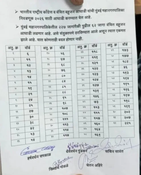 या पत्रकार परिषदेत वंचितचे प्रदेश उपाध्यक्ष धैर्यवर्धन पुंडकर यांनी मुंबई महानगरपालिकेच्या (BMC Election 2026) २२७ जागांपैकी ६२ जागांवर वंचित बहुजन आघाडी आपले उमेदवार उभे करणार असल्याचे सांगितले. तर काँग्रेस आणि शरद पवारांच्या राष्ट्रवादीत देखील चर्चा सुरु असून, शरद पवार गटाला (NCP Sharad Pawar) केवळ ९ जागा सोडण्यासाठी काँग्रेस तयार असल्याची माहिती समोर आली आहे. त्यामुळे काँग्रेसने मुंबईत किती जागा लढवणार? याबाबत जाहीर केले नसल्याची चर्चा राजकीय वर्तुळात रंगली आहे.