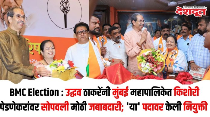 ठाकरेंच्या शिवसेनेच्या गटनेतेपदी माजी महापौर किशोरी पेडणेकर (Kishori Pednekar) यांची निवड करण्यात आली आहे. मुंबईतील वॉर्ड क्रमांक १९९ मधून पेडणेकर निवडून आल्या असून, त्यांनी शिवसेना शिंदे गटाच्या रुपल कुसळे यांचा पराभव केला. ठाकरेंच्या सेनेकडून महापालिकेत विविधपदे भूषवलेल्या विशाखा राऊत, किशोरी पेडणेकर, मिलिंद वैद्य, श्रद्धा जाधव यांची नावे गटनेते पदासाठी चर्चेत होती. मात्र, पक्ष प्रमुख उद्धव ठाकरेंनी किशोरी पेडणेकरांच्या नावावर शिक्कामोर्तब केले.