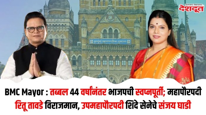 बहुचर्चित मुंबई महानगरपालिकेच्या महापौरपदी (BMC Mayor) भाजपाच्या रितू तावडे (Ritu Tawade) तर उपमहापौरपदी शिंदे शिवसेनेचे संजय घाडी (Sanjay Ghadi) विराजमान झाले आहेत. यावेळी मुख्यमंत्री देवेंद्र फडणवीस आणि उपमुख्यमंत्री एकनाथ शिंदे देखील उपस्थित होते. तब्बल ४४ वर्षांनतर मुंबई महापलिकेत भाजपचा दुसरा महापौर बसला आहे. त्याआधी भाजपचे निष्ठावान असलेले डॉ. प्रभाकर पै हे १९८२ ते १९८३ सालामध्ये मुंबईचे महापौर झाले होते. महापालिका निवडणुकीनंतर महापौरपदासाठी भाजप आणि शिंदे सेनेत रस्सीखेच सुरु होती. अखेर भाजपच्या रितू तावडे यांच्या नावावर शिक्कामोर्तब झाले आणि त्यांनी मुख्यमंत्री आणि उपमुख्यमंत्र्यांच्या उपस्थितीत आज पदभार स्वीकारला.
