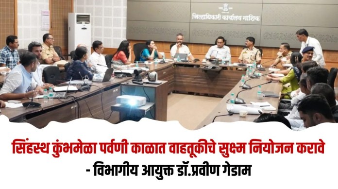 आगामी सिंहस्थ कुंभमेळयात पर्वणी कालावधीत नाशिक व त्र्यंबकेश्वर येथे देशभरातून मोठ्या संख्यने भाविक उपस्थित राहणार आहेत. यादृष्टीने रेल्वे, हवाई मार्ग, बसेस, कार यासह पायी येणारे भाविक, त्यांना इच्छीत स्थळी पोहचण्याची व्यवस्था, वाहनतळ व्यवस्था, गर्दीचे नियोजन व अनुषंगिक बाबी याबाबत सर्व यंत्रणांच्या समन्वयातून सुक्ष्म नियोजन करण्यात यावे, अशा सूचना विभागीय आयुक्त डॉ. प्रवीण गेडाम यांनी दिल्या.