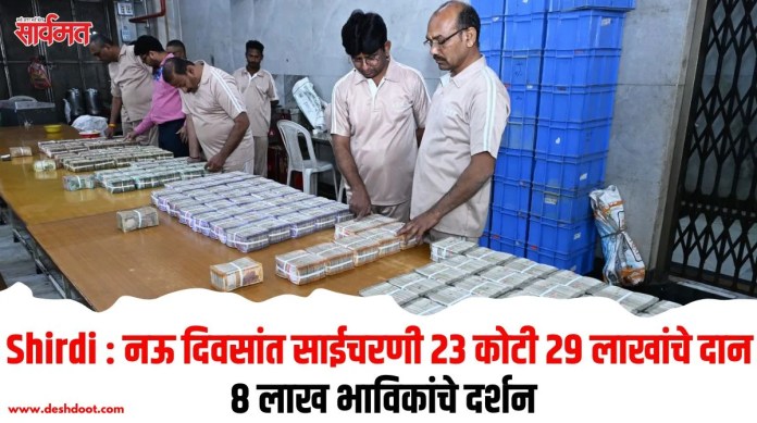 नाताळची सुट्टी, सरत्या वर्षाला निरोप आणि नवीन वर्षाच्या स्वागतानिमित्त शिर्डीत आयोजित करण्यात आलेल्या ‘शिर्डी महोत्सवात’ साईभक्तांचा जनसागर लोटला होता. 25 डिसेंबर 2025 ते 2 जानेवारी 2026 या नऊ दिवसांच्या कालावधीत सुमारे 8 लाखांहून अधिक भाविकांनी साईबाबांच्या समाधीचे दर्शन घेतले. या काळात भाविकांनी श्रद्धेने तब्बल 23 कोटी 29 लाख 23 हजार 373 रुपयांचे भरभरून दान संस्थानच्या झोळीत अर्पण केले आहे, अशी माहिती मुख्य कार्यकारी अधिकारी गोरक्ष गाडीलकर यांनी दिली.