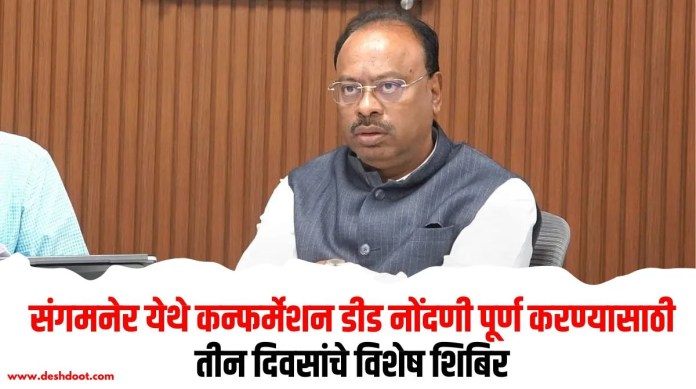अहिल्यानगर जिल्ह्याच्या संगमनेर येथील इंदिरानगर भागातील नागरिकांच्या कन्फर्मेशन डीड नोंदणी पूर्ण करण्यासाठी पुढील तीन दिवसांत विशेष शिबिर आयोजित करण्यात येईल. त्याचबरोबर ही नोंदणी करुन घेणे आवश्यक असताना ती न करणार्या सह दुय्यम निबंधकाची बदली करण्यात येईल, असे महसूल मंत्री चंद्रशेखर बावनकुळे यांनी विधान परिषदेत सांगितले