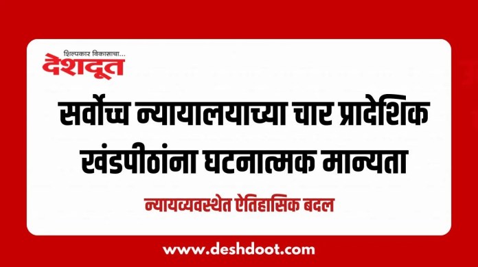 भारतीय न्यायव्यवस्थेच्या इतिहासात मैलाचा दगड ठरणारा निर्णय घेण्यात आला असून, सर्वोच्च न्यायालयाच्या चार कायमस्वरूपी प्रादेशिक खंडपीठांना घटनात्मक मान्यता देण्यात आली आहे.