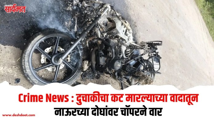 दुचाकीचा कट मारल्याच्या वादातून सिनेस्टाईलने पाठलाग करत नाऊरच्या दोघा तरुणांवर चॉपरने वार केल्याची घटना काल नाऊर चौफुली येथे घडली. संतप्त ग्रामस्थांनी पाठलाग करणार्यांच्या दोन्ही दुचाकी जाळून टाकल्या. हल्लेखोर पळून जाण्यात यशस्वी ठरले.