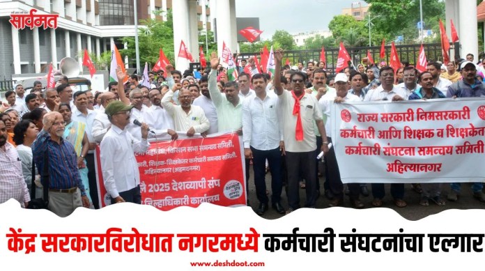 केंद्र सरकारच्या खासगीकरणाच्या धोरणांविरोधात तसेच नव्याने लागू केलेल्या चार श्रमसंहितांमुळे देशातील कामगारांचे हक्क धोक्यात आल्याच्या निषेधार्थ बुधवारी (9 जुलै) देशभरातील कामगार संघटनांनी पुकारलेल्या संपाला अहिल्यानगर शहरात जोरदार प्रतिसाद मिळाला. या पार्श्वभूमीवर सरकारी, निमसरकारी, शिक्षक, शिक्षकेतर, बीएसएनएल, महापालिका कर्मचारी आणि विविध युनियनने एकत्र येत जिल्हाधिकारी कार्यालयावर धडक मोर्चा काढून सरकारविरोधात तीव्र घोषणा देत निषेध व्यक्त केला.
