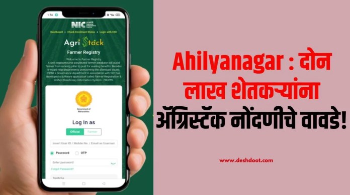 नगर 68.37, नेवासा 72.50, श्रीगोंदा 78.89, पारनेर 92.89, पाथर्डी 71.64, शेवगाव 79.16, कर्जत 87.77, जामखेड 93.54, संगमनेर 73.63, अकोले 94.46, श्रीरामपूर 89.57, राहुरी 81.82, राहाता 76.16 आणि कोपरगाव 75.75 अशी अॅग्रीस्टॅकची नोंदणी झालेली आहे.