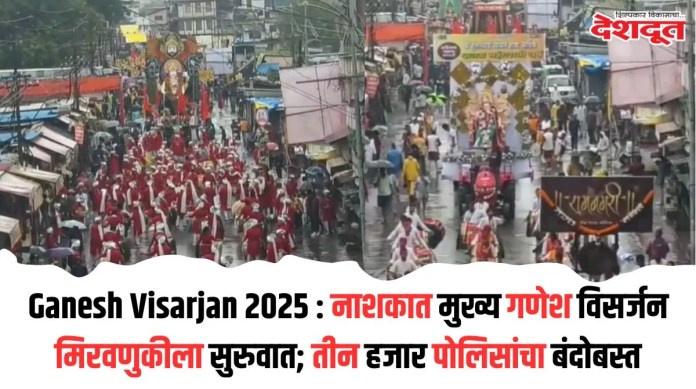 अनंत चतुर्दशीनिमित्त आज (शनिवारी) सकाळी ११ वाजता भद्रकालीतील (Bhadrakali) वाकडी बारव येथून मुख्य गणेश विसर्जन मिरवणुकीला (Ganesh Immersion Procession) सुरुवात झाली आहे. लेझीम आणि ढोल ताशांसह पुष्पवर्षावात विसर्जन मिरवणुकीला प्रारंभ झाला आहे. या विसर्जनासाठी तीन हजार पोलिसांचा फौजफाटा मध्यरात्री दीड वाजेपर्यंत तैनात राहणार आहे.