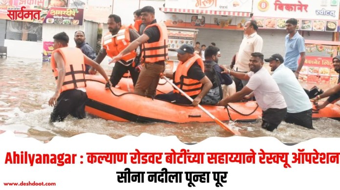 शनिवारी रात्री ते रविवारी सकाळपर्यंत मुसळधार पावसाने नगर शहरा लगत वाहणार्या सीना नदीने धोक्याची पातळी ओलांडून पुराचे पाणी कल्याण रोडवरील अनेक वसाहतीमध्ये घुसले. परिणामी काही ठिकाणच्या नागरिकांना स्थलांतर करावे लागले, तसेच त्यांच्या संसारोपयोगी साहित्यांचे नुकसानही झाले. सुमारे 30 वर्षांच्या खंडानंतर सीना नदीला एवढा मोठा पूर आला. दरम्यान कल्याण रोडवर रविवारी चक्क होडीचा वापर करून नागरिकांना मदत कार्य करण्याची वेळ आली. सायंकाळी उशीरापर्यंत मनपाच्या रेस्क्यू टिमसह अग्नीशमन विभागाच्या जवानांनी अनेक कुटूंबाना पूराच्या पाण्यातून सुखरूप बाहेर काढले.