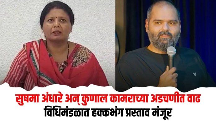 महाराष्ट्र विधिमंडळाच्या पावसाळी अधिवेशनात कॉमेडियन कुणाल कामरा आणि शिवसेना (ठाकरे गट) नेत्या सुषमा अंधारे यांच्याविरुद्ध हक्कभंग प्रस्तावाला मंजुरी मिळाली आहे. उपमुख्यमंत्री एकनाथ शिंदे यांच्यावर व्यंगात्मक टीका केल्याप्रकरणी आणि त्यास समर्थन दिल्याप्रकरणी या दोघांवर ही कारवाई झाली आहे. सूत्रांनुसार, येत्या सोमवारी दोघांनाही नोटीस बजावली जाणार आहे. यामुळे कामरा आणि अंधारे यांच्या अडचणी वाढण्याची शक्यता आहे.
