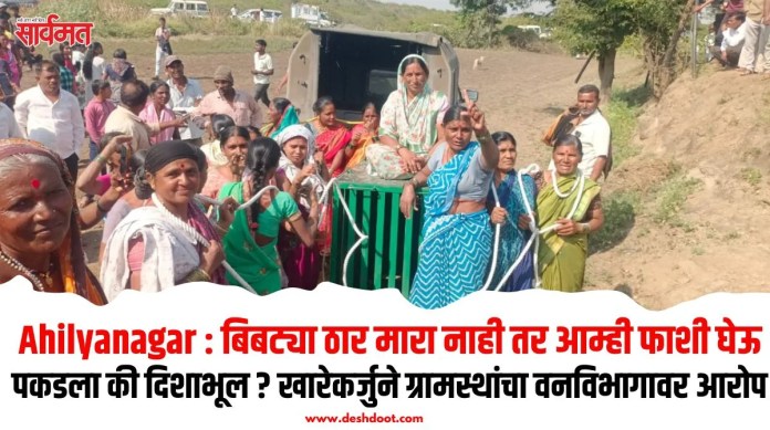तालुक्यातील खारेकर्जुने आणि परिसरात आठ दिवसांपासून बिबट्याने धुमाकूळ घातला आहे. रविवारी (16 नोव्हेंबर) रात्री वन विभागाने लावलेल्या पिंजर्यात एक बिबट्या अडकला असल्याचा दावा वनविभागाने केला. पण वनविभाग खोटे बोलत असल्याची शंका गावकर्यांनी व्यक्त केली. त्याचवेळी खारेकर्जुने येथे एक बिबट्या विहिरीत पडलेला आढळून आल्याने गोंधळ अधिक वाढला. दरम्यान, विहिरीत पडलेल्या बिबट्याला नेण्यासाठी वनविभागाचे कर्मचारी पिंजरा घेऊन आले असता गावातील महिलांनी त्यांना मज्जाव केला. एक तर बिबट्याला ठार मारा, अन्यथा आम्ही फाशी घेऊ, अशी आक्रमक भूमिका घेत विरोध केला.
