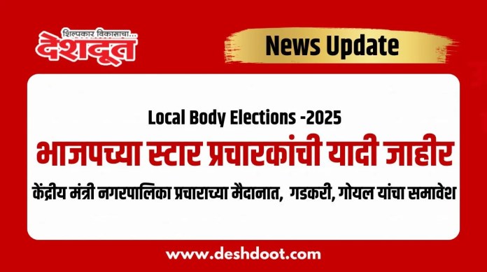 राज्यातील २४६ नगरपालिका आणि ४२ नगरपंचायतीच्या निवडणुकीसाठी भारतीय जनता पक्षाने बुधवारी आपल्या स्टार प्रचारकांची यादी जाहीर केली. या यादीत मुख्यमंत्री देवेंद्र फडणवीस यांच्यासह केंद्रीय मंत्री नितीन गडकरी, पियुष गोयल, मुरलीधर मोहोळ, रक्षा खडसे, राष्ट्रीय सह संघटन मंत्री शिव प्रकाश, केंद्रीय सरचिटणीस विनोद तावडे यांचा समावेश आहे. याशिवाय माजी मुख्यमंत्री नारायण राणे, अशोक चव्हाण तसेच अल्पसंख्याक समाजातील इद्रिस मुलतानी यांना स्टार प्रचारकांच्या यादीत स्थान देण्यात आले आहे.