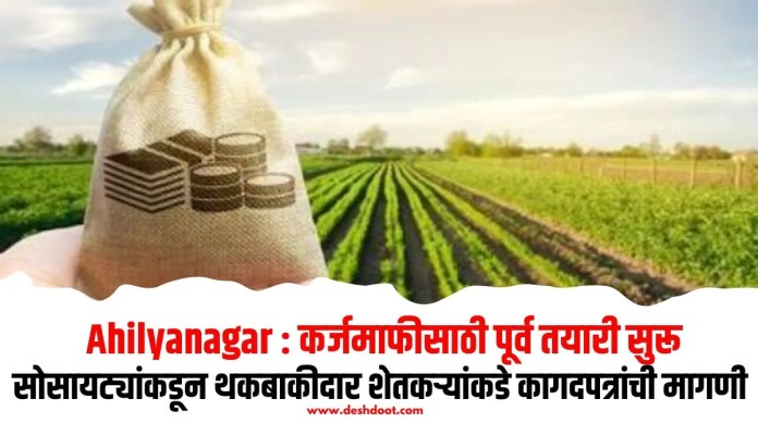 नगर तालुक्यात विविध गावात सहकारी सोसायट्यांनी थकबाकीदार शेतकर्यांकडून विविध कागदपत्रांची पूर्तता करण्याच्या सुचना केल्या आहेत. कर्जमाफीच्या पूर्व तयारीचा हा भाग असल्याचे सांगण्यात आले. लवकरात लवकर थकबाकीदार शेतकर्यांनी त्यांच्याकडे असणार्या कर्जाच्या तपशीलासह अन्य कागदपत्रे सोसायटी पातळीवर जमा करण्याच्या सुचना देण्यात आल्या आहे. राज्य सरकारच्यावतीने जून 2026 पर्यंत कर्जमाफीची प्रक्रिया राबवण्यात येणार असल्याची घोषणा करण्यात आलेली आहे.