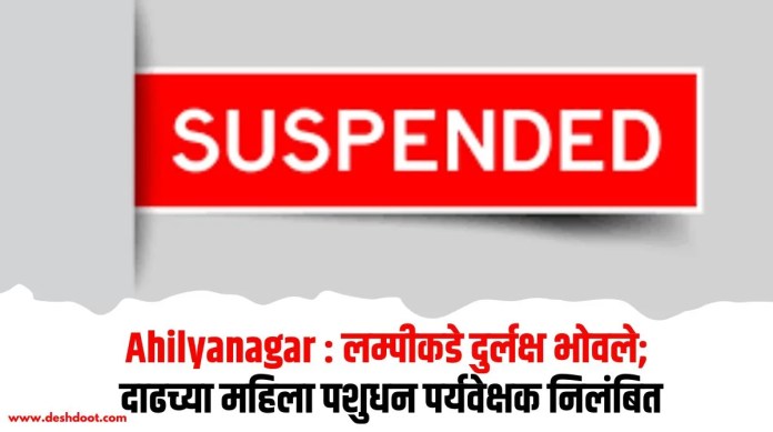 जिल्ह्यात गायवर्गीय जनावरांमध्ये लम्पी आजाराचा फैलाव मोठ्या प्रमाणावर आढळू लागला आहे. जिल्ह्यात पूशसंवर्धन विभागाने 92 टक्के जनावरांचे लसीकरण केल्यानंतरही खराब हवामानामुळे जनावरांमध्ये लम्पी आजाराची व्याप्ती वाढतांना दिसत आहे. पशूसंवर्धन विभागाकडे नोंदणी झालेल्यामध्ये आतापर्यंत 20 जनावरांचा लम्पीमुळे मृत्यू झाल्याचे सांगण्यात आले. प्रत्यक्षात हा आकडा पाच ते दहा पट अधिक असल्याची भिती व्यक्त होत आहे. दरम्यान, राहाता तालुक्यात सर्वाधिक लम्पीच्या केसेस असतांना त्याकडे दुर्लक्ष करत दांड्या मारणार्या महिला पशूधन पर्यवेक्षक दर्शना सातदिवे यांच्यावर जिल्हा परिषदेचे मुख्य कार्यकारी अधिकारी आनंद भंडारी यांनी निलंबनाची कारवाई केली आहे.