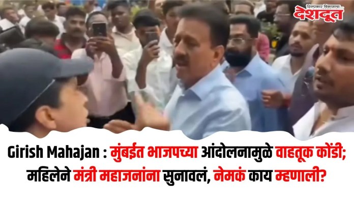 लोकसभेत (Loksabha) महिला आरक्षण घटनादुरुस्ती विधेयक नामंजूर झाल्यानंतर राज्यातील भाजप (BJP) महायुतीच्या (Mahayuti) नेत्यांनी विरोधकांवर जोरदार हल्लाबोल केला.त्याच पार्श्वभूमीवर काल (मंगळवार) मुंबईतील वरळी डोम येथे भाजप महायुतीच्यावतीने जनआक्रोश महिला संमेलनाचे आयोजन करण्यात आले होते. मात्र, या संमलेनासाठी जाताना आंदोलकांकडून वाहतूक कोंडी झाल्याने एका महिलेने चक्क मंत्री गिरीश महाजन यांनाच सुनावल्याचा व्हिडिओ व्हायरल झाला आहे.