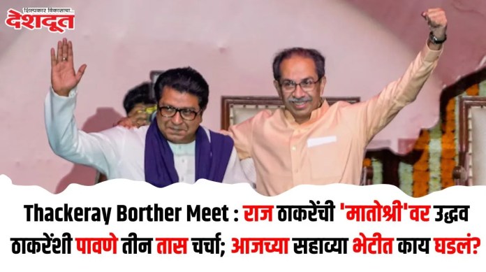 आगामी स्थानिक स्वराज्य संस्थांच्या आगामी निवडणुकांसाठी मनसे आणि ठाकरेच्या शिवसेना पक्षात युतीच्या जोरदार चर्चा सुरू आहेत. गेल्या अनेक वर्षांपासून दुरावा असलेल्या ठाकरे बंधूंमध्ये सौहार्द आणि जवळीक सातत्याने वाढत असल्याने आता थेट युतीच्या शक्यतांवर विचारमंथन सुरू असल्याचे बोलले जात आहे. त्यातच आज (रविवारी) मनसेचे अध्यक्ष राज ठाकरे (Raj Thackeray) हे सहकुटुंब उद्धव ठाकरे यांच्या ‘मातोश्री’ निवासस्थानी पोहोचले. कौटुंबिक स्नेहभोजनासाठी ही भेट असल्याचे बोलले जात असून, उद्धव आणि राज ठाकरे या दोन बंधूंमध्ये तब्बल पावणे तीन तास चर्चा झाल्याची माहिती आहे.