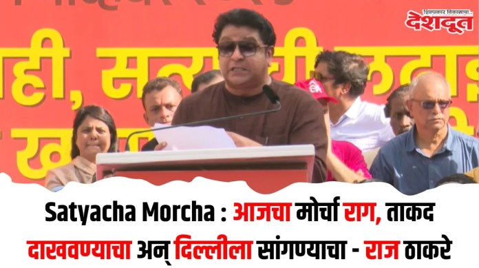 मतदार यादीतील घोळ, दुबार नावे आणि मतचोरीच्या आरोपांवरून आज (०१ नोव्हेंबर) रोजी मविआसह मनसेच्या वतीने मुंबईत निवडणूक आयोगाविरोधात ‘सत्याचा मोर्चा’ या टॅगलाइन खाली फॅशन स्ट्रीट ते मेट्रो सिनेमामार्गे हा मोर्चा काढण्यात आला. त्यानंतर मुंबई महापालिकेच्या प्रवेशद्वारावर थांबविण्यात आला आहे. या मोर्चात राष्ट्रवादी काँग्रेस शरदचंद्र पवार पक्षाचे नेते शरद पवार, शिवसेना ठाकरे पक्षाचे उद्धव ठाकरे, मनसेप्रमुख राज ठाकरे, काँग्रेसचे नेते बाळासाहेब थोरात यांच्यासह आदी नेते उपस्थित होते.