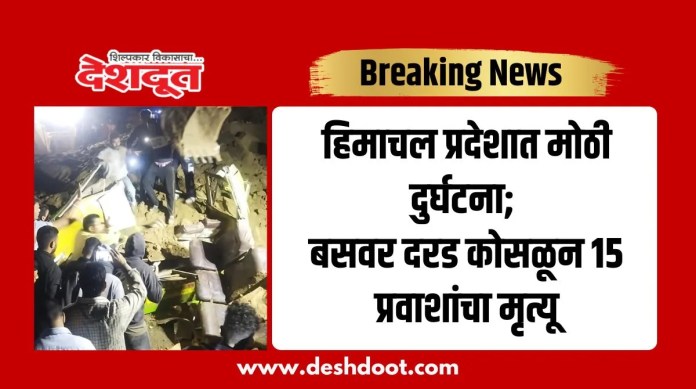 आज रात्री हिमाचल प्रदेशातील बिलासपुर जिल्ह्यात एका बसवर डोंगराचा ढिगारा कोसळून मोठा अपघात झाला आहे. या घटनेत बसमधील पंधरा प्रवाशांचा जागीच मृत्यू झाला असून तसेच अनेक जण गंभीर जखमी झाले आहेत. या घटनेनंतर स्थानिकांनी बचावकार्य सुरू केले असू मातीचा ढिगारा हटवण्याचे काम सुरु आहे. सध्या घटनास्थळी पोलीस आणि प्रशासनाचे पथकही पोहोचले असून जेसीबीच्या मदतीने माती हटवली जात आहे.