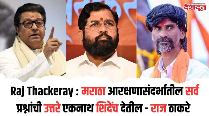 राज ठाकरे आज (शनिवार) ठाणे दौऱ्यावर होते. यावेळी त्यांनी ठाण्यातील (Thane) पदाधिकाऱ्यांशी संवाद साधला. त्यानंतर माध्यमांनी राज ठाकरेंना मुंबईतील मराठा आरक्षणाबाबत प्रश्न विचारला. यावर बोलतांना राज ठाकरे म्हणाले की, “मराठा आरक्षणासंदर्भात सर्व प्रश्नांची उत्तर एकनाथ शिंदेंच (Eknath Shinde) देऊ शकतील. जेव्हा एकनाथ शिंदे येतील तेव्हा त्यांना विचारा मुंबईकरांना खूप त्रास होत आहे. एकनाथ शिंदे मागच्यावेळी नवी मुंबईत गेले होते, त्यावेळी त्यांनी प्रश्न सोडवला होता ना, मग हे परत का आले. या प्रश्नांची सगळी उत्तरं एकनाथ शिंदे देतील, असे म्हणत त्यांनी उपमुख्यमंत्री एकनाथ शिंदेंना एकप्रकारे कात्रीत पकडले आहे.