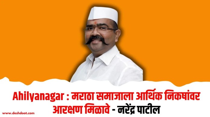 मराठा समाजाला आर्थिक निकषांच्या आधारे आरक्षण मिळावे, अशी ठाम भूमिका अण्णासाहेब पाटील आर्थिक मागास विकास महामंडळाचे अध्यक्ष नरेंद्र अण्णासाहेब पाटील यांनी मांडली. मुख्यमंत्री देवेंद्र फडणवीस यांच्या कार्यकाळात मिळालेले आरक्षण सर्वोच्च न्यायालयात सक्षमपणे सादर न केल्यामुळे नाकारले गेले, असा आरोप करत त्यांनी शिवसेनेच्या नेतृत्वातील पूर्वीच्या सरकारवर निशाणा साधला.
