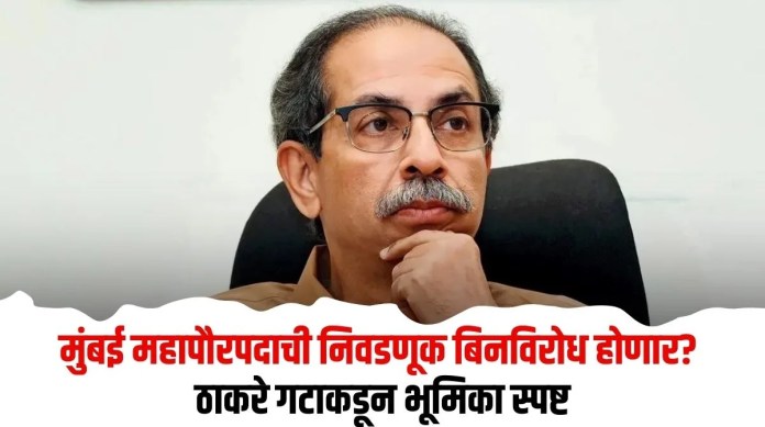 मुंबई महानगरपालिकेच्या आगामी महापौरपदाच्या निवडणुकीत आता मोठी राजकीय उलथापालथ पाहायला मिळत आहे. भारतीय जनता पक्षाने (भाजप) महापौरपदासाठी रितू तावडे यांच्या नावाची घोषणा केल्यानंतर, ही निवडणूक आता बिनविरोध होण्याची चिन्हे निर्माण झाली आहेत. ठाकरे गटाने या निवडणुकीतून माघार घेण्याचे संकेत दिल्याने भाजपचा सत्तेचा मार्ग मोकळा झाला आहे.