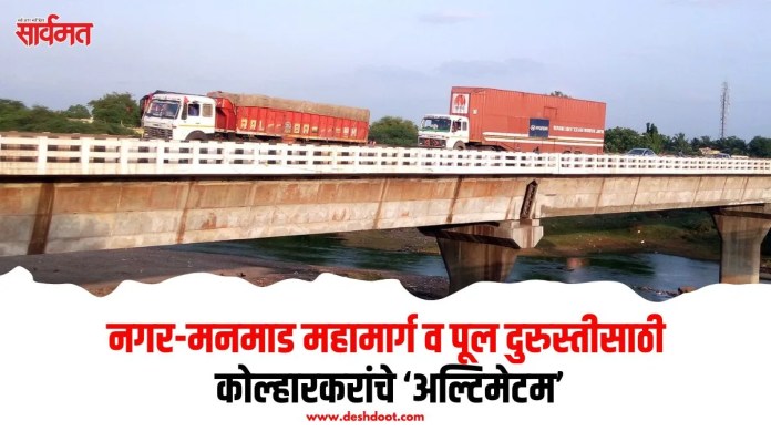 नगर-मनमाड महामार्गावर कोल्हारच्या पुलावर पडलेल्या खड्ड्यांमुळे दररोज तासनतास खोळंबणार्या वाहतूक समस्येला कोल्हार बुद्रुक, भगवतीपूर आणि कोल्हार खुर्द येथील ग्रामस्थ वैतागले आहेत. वर्षानुवर्षांपासून येथे कायम ठप्प होणारी वाहतूक डोकेदुखी बनली आहे. या समस्येमुळे येथील बाजारपेठ उध्वस्त होत आहे. मात्र ही समस्या सोडविण्यासाठी कुणालाही फुरसत नाही. या समस्येसंबंधी कोल्हार बुद्रुक ग्रामपंचायत आणि येथील व्यापारी संघटनेने राष्ट्रीय राजमार्ग प्राधिकरण मंडळास निवेदन दिले. 15 दिवसात प्रश्न मार्गी न लागल्यास उग्र आंदोलन छेडण्याचा सज्जड इशारा देण्यात आला आहे.