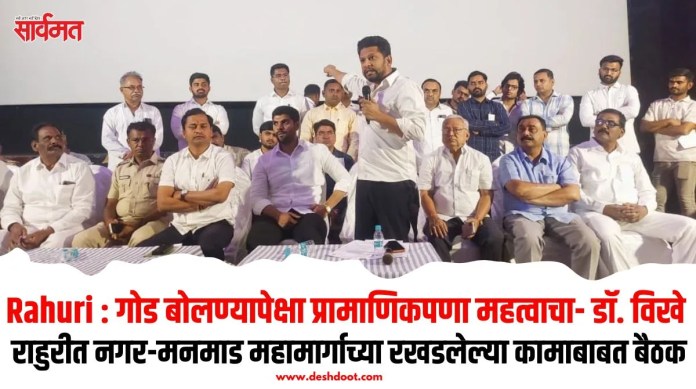 डॉ. विखे पाटील म्हणाले, राहुरी शहरातून जाणार्या नगर मनमाड महामार्गाचे काम सध्या प्रगतीपथावर असून 20 फेब्रुवारीपर्यंत ते पूर्ण करण्याचे उद्दिष्ट ठेवण्यात आले आहे. या कालावधीत नागरिकांनी आणि प्रवाशांनी संयम व सहकार्य ठेवावे. महामार्गालगतच्या बंदिस्त साईड गटारापासून चार मीटरपर्यंत असलेली अतिक्रमणे संबंधित व्यापारी व नागरिकांनी स्वतःहून हटवावीत, अन्यथा प्रशासनामार्फत कारवाई केली जाईल, असा स्पष्ट इशाराही त्यांनी दिला. सध्या राहुरी शहर हद्दीत साईड गटाराचे काम सुरू असून गटारी रस्त्याच्या पातळीपेक्षा उंच झाल्याने व्यवसायावर परिणाम होत असल्याच्या तक्रारी व्यापार्यांकडून मांडण्यात आल्या.