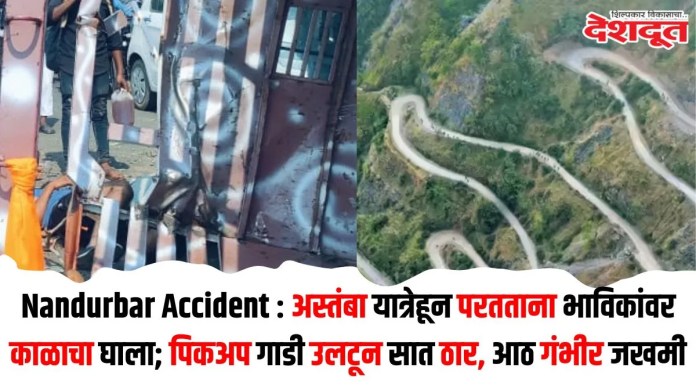 झालेल्या अपघातात सात जणांचा मृत्यू (Death) झाला आहे. तर आठ जण गंभीर आणि १० जण किरकोळ जखमी झाले आहे. मृतांमध्ये बहुतांश नंदुरबार तालुक्यातील (Nandurbar Taluka) भाविकांचा समावेश आहे.