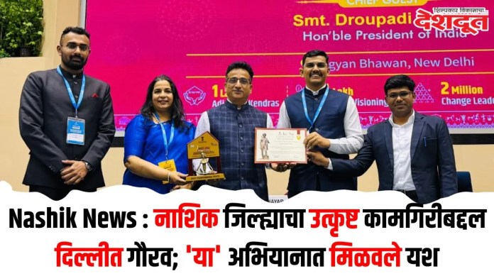 ‘आदीकर्मयोगी अभियान’ (Adikarmayogi Campaign) अंतर्गत राज्यातील उत्कृष्ट कामगिरीबद्दल नाशिक जिल्ह्याला (Nashik District) शुक्रवार (दि.१७) ऑक्टोबर रोजी गौरविण्यात आले. हा सन्मान राष्ट्रपती द्रौपदी मुर्मु यांच्या प्रमुख उपस्थितीत नवी दिल्ली येथील विज्ञान भवन येथे प्रदान करण्यात आला.