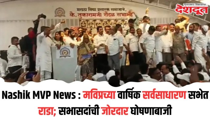 नाशिक जिल्ह्यातील (Nashik District) महत्त्वाची शिक्षण संस्था असलेल्या मराठा विद्या प्रसारक समाज संस्थेच्या विद्यापीठ (University) स्थापन करण्यावरून सत्ताधारी आणि विरोधक आमनेसामने आले आहेत. दरवर्षीप्रमाणे आज (रविवारी) मविप्रची १११ वी वार्षिक सर्वसाधारण सभा आयोजित करण्यात आली होती. या सभेत स्वतंत्र्य विद्यापीठ स्थापन करण्यावरून दोन्ही बाजूंचे सभासद आमनेसामने आल्याचे बघायला मिळाले. त्यामुळे सभेत चांगलाच राडा झाला.