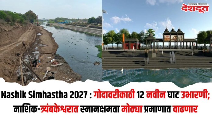 सिंहस्थ कुंभमेळा २०२७ च्या पार्श्वभूमीवर नाशिक आणि त्र्यंबकेश्वर (Nashik and Trimbakeshwar) येथे गोदावरी नदीकाठावर १२ नवीन घाट उभारण्यात येत असून, भाविकांसाठी उपलब्ध होणारी स्नान व धार्मिक विधींची क्षमता मोठ्या प्रमाणात वाढणार आहे. नाशिक महानगरपालिका, महाराष्ट्र राज्य पायाभूत विकास महामंडळ आणि जलसंपदा विभाग यांच्या माध्यमातून ही कामे सुरू असून, कुंभमेळ्यापूर्वी ती पूर्ण करण्याचे नियोजन आहे.