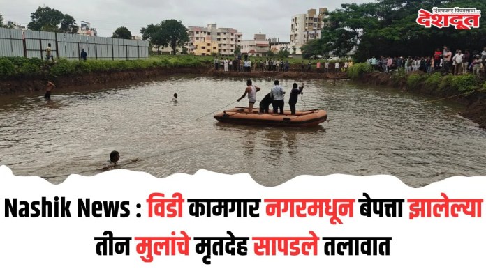 नाशिक शहरातील (Nashik City) आडगाव परिसरातील (Aadgaon Area) विडी कामगार नगर येथील बेपत्ता झालेल्या तीन लहान मुलांचे मृतदेह (Dead Body) तलावात (Lake) सापडले आहेत. त्यामुळे एकच खळबळ उडाली आहे. साई गोरक्ष गरड (१४), साई केदारनाथ उगले (१३) आणि साहिल हिलाल जाधव (१४) असे तिन्ही मुलांची नावे आहेत.