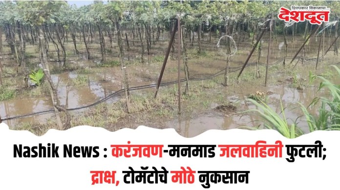 मनमाड शहरासाठी (Manmad City) महत्त्वपूर्ण असलेल्या करंजवण-मनमाड (Karanjavan-Manmad) थेट जलवाहिनी पाणीपुरवठा योजनेची मुख्य जलवाहिनी फुटली आहे. त्यामुळे खेडगाव, शिंदवड येथील शेतकर्यांचे द्राक्ष, टोमॅटो आदी पिकांचे मोठे नुकसान झाले आहे. करंजवण-मनमाड पाणीपुरवठा योजना ही जवळजवळ साडेतीनशे ते चारशे कोटी रुपयांपेक्षा जास्त रकमेचा प्रकल्प अवघ्या दीड वर्षात पूर्णत्वास नेण्यात आला आहे. अद्यापही या योजनेचे काही कामे सुरू आहे. उद्घाटन होण्यापूर्वी या योजनेचे तीन ते चार वेळा जलपूजन देखील झाले आहे.