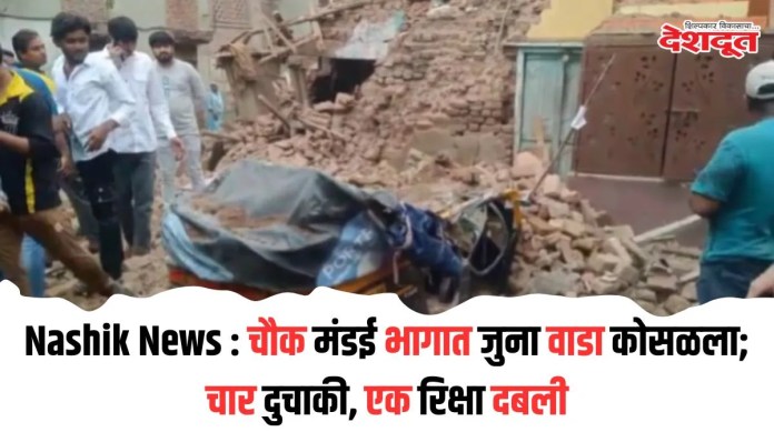 शहरातील चौक मंडई (Chowk Mandai) भागातील वजरे कॉम्प्लेक्सच्या मागे बंद असलेला एक जुना वाडा आज (मंगळवारी) दुपारी पावणे तीन वाजेच्या सुमारास घडली. या घटनेत कुठलीही जीवितहानी झालेली नसून, वाहनाचे मात्र मोठ्या प्रमाणावर नुकसान (Damage) झाले आहे.