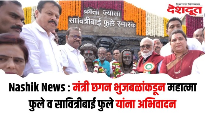क्रांतीज्योती सावित्रीबाई फुले (Savitribai Phule) यांच्या जयंतीच्या निमित्ताने राज्याचे अन्न, नागरी पुरवठा व ग्राहक संरक्षण मंत्री छगन भुजबळ (Minister Chhagan Bhujbal) यांनी आज मुंबई नाका येथील स्मारकात क्रांतीसुर्य महात्मा फुले व ज्ञानज्योती सावित्रीबाई फुले यांच्या पुतळ्यास पुष्पहार अर्पण करत विनम्र अभिवादन केले. यावेळी उपस्थित बांधवांशी संवाद साधला.