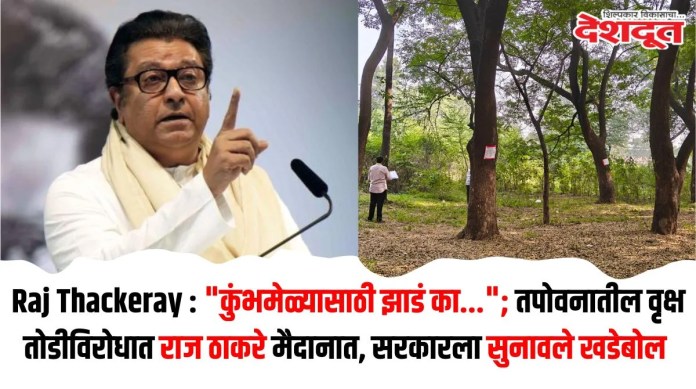 आगामी सिंहस्थासाठी तपोवनातील (Tapovan) तब्बल १८०० झाडं तोडली जाणार जाणार आहे. मात्र या झाडांच्या तोडीला नाशिकमधील नागरिकांनी तीव्र आंदोलन करत विरोध दर्शविला आहे. कालच ठाकरेंच्या शिवसेनेचे प्रमुख उद्धव ठाकरे (Uddhav Thackeray) यांनी प्रभू श्री रामचंद्रांच्या पदस्पर्शाने पावन झालेल्या मोजक्या जागांपैकी तपोवन ही एक आहे. तपोवनमध्ये जवळपास ६० वेगवेगळ्या प्रकारची झाडे आहेत, त्यातील अनेक औषधी वनस्पती आहेत. अनेक वर्षांपासून तिथे निसर्गाचे चक्र सुरू आहे. या तपोवनाने आपल्यापेक्षाही जास्त कुंभमेळे अनुभवलेले असतील, असे म्हणत त्यांनी तपोवनातील झाडे तोडण्यास विरोध केला होता. यानंतर आता मनसे अध्यक्ष राज ठाकरेंनी देखील कुंभमेळ्यासाठी झाडं का तोडावी लागत आहेत? असा सवाल करत तपोवनातील झाड तोडीला विरोध केला आहे.