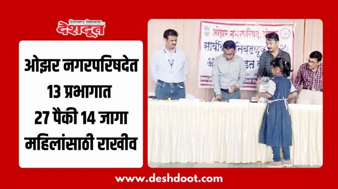 ओझर नगरपरिषद स्थापनेनंतर प्रथमच होणार्या सार्वत्रिक पंचवार्षिक निवडणुकीसाठी शहर व उपनगरातील एकुण तेरा प्रभागातील आरक्षण येथील पगार गवळी मंगल कार्यालयात दिंडोरी उपविभागीय अधिकारी आप्पासाहेब शिंदे, ओझर नगरपरिषद मुख्याधिकारी किरण देशमुख, तलाठी सागर शिर्के यांच्या प्रमुख उपस्थितीत शालेय विद्यार्थ्यांकडून आरक्षण सोडत काढण्यात आले.