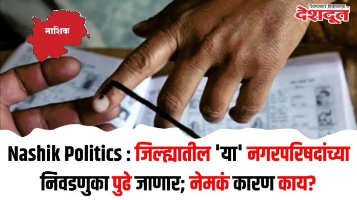 नाशिक जिल्ह्यातील (Nashik District) चांदवड आणि ओझर या नगरपरिषदांची निवडणूक पुढे जाण्याची शक्यता आहे. तर अहिल्यानगर जिल्ह्यातील कोपरगाव, नेवासा, देवळाली आणि पाथर्डी या नगरपरिषदांचा समावेश आहे. चांदवड आणि ओझर नगरपरिषदांचा संपूर्ण कार्यक्रम पुढे जाणार की काही प्रभागांमधीलच निवडणुका (Election) पुढे जाणार याबाबत निवडणूक आयोगाकडून स्पष्टीकरण आलेले नसल्याने त्याकडे लक्ष लागले आहे.