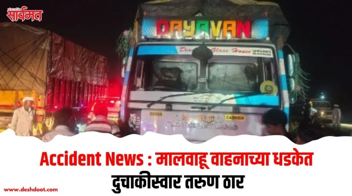 नाशिक-पुणे राष्ट्रीय महामार्गावरील (Nashik-Pune Highway) वेल्हाळे शिवारातील हॉटेल अंबिका समोर नाशिकवरुन पुणेकडे जाणार्या एका मालवाहू वाहनाने समोरुन दिलेल्या धडकेत डोंगरगाव (ता.अकोले) येथील दुचाकीस्वार तरुण जागीच ठार (Youth Death) झाला. सदर घटना गुरुवारी (दि.23) रात्री पावणे आठ वाजेच्या सुमारास घडली. याबाबत संगमनेर शहर पोलिसांकडून मिळालेली माहिती अशी, की डोंगरगाव येथील दिगंबर रामदास उगले (वय 27) हा तरुण वाहनांच्या शोमरुममध्ये कामास होता.