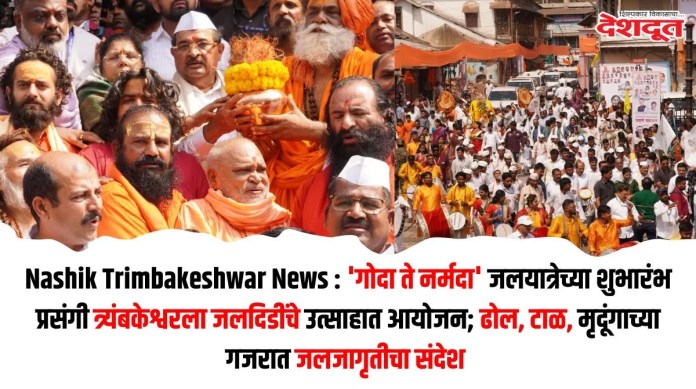 राज्यातील जलव्यवस्थापन अधिक प्रभावी, लोकाभिमुख व शाश्वत करण्याच्या उद्देशाने आयोजित ‘गोदा ते नर्मदा (Goda to Narmada) पुण्यश्लोक अहिल्यादेवी होळकर जलयात्रा २०२६’ च्या शुभारंभ प्रसंगी त्र्यंबकेश्वर (Trimbakeshwar) येथे जलदिंडीचे आयोजन करण्यात आले. ढोल, टाळ, मृदूंगाच्या गजरात आणि पारंपरिक संस्कृतीचे दर्शन घडवीत उत्साहाने जलजागृतीचा संदेश देण्यात आला.