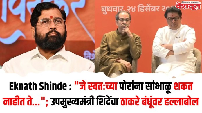 आगामी महापालिका निवडणुकीच्या पार्श्वभूमीवर शिवसेना उद्धव बाळासाहेब ठाकरे पक्षाचे प्रमुख उद्धव ठाकरे आणि मनसेप्रमुख राज ठाकरे (Uddhav Thackeray and Raj Thackeray) यांनी मुंबईतील ब्ल्यू सी हॉटेलमध्ये एकत्रित पत्रकार परिषद घेत अधिकृतपणे युतीची घोषणा केली. यावेळी राज ठाकरेंनी “महाराष्ट्रात सध्या ज्याप्रमाणे लहान मुले पळवणारी टोळी सक्रिय आहे, तशाच काही राजकीय टोळ्या उमेदवार पळवण्याचे काम करत आहेत,” असा टोला सत्ताधाऱ्यांना लगावला होता. त्यानंतर आता यावरून उपमुख्यमंत्री एकनाथ शिंदे यांनी ठाकरे बंधूंवर निशाणा साधला आहे. ते मुंबईत प्रसारमाध्यमांशी बोलत होते.
