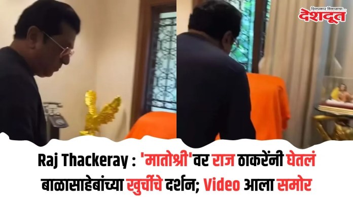 यानंतर राज ठाकरेंनी शिवसेना प्रमुख दिवंगत बाळासाहेब ठाकरे (Balasaheb Thackeray) यांना अभिवादन केले. तसेच बाळासाहेब ठाकरे ज्या खुर्चीवर बसायचे, त्या खुर्चीचे राज ठाकरेंनी दर्शन घेतले. यावेळी दोघांमध्ये मातोश्रीत लावलेल्या व्यंगचित्रांबाबत चर्चा झाली. जवळपास २० मिनिटे दोघे ‘मातोश्री’ या निवासस्थानामध्ये होते.