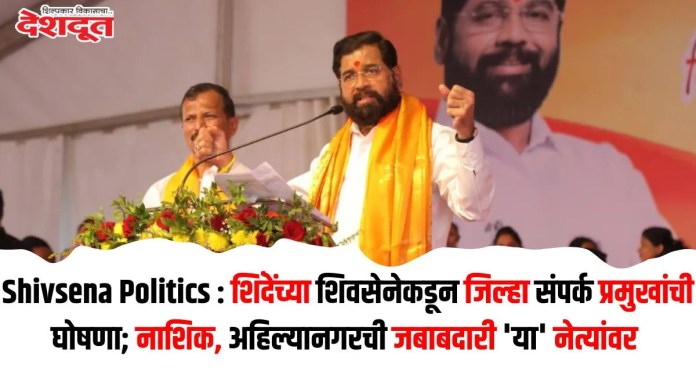 उपमुख्यमंत्री एकनाथ शिंदे (Eknath Shinde) यांनी ४० जिल्हा संपर्कप्रमुखांची घोषणा केली असून, या सर्वांना निवडणुका होईपर्यंत जिल्ह्यातच थांबण्याचे निर्देश पक्ष नेतृत्वाने दिले आहेत. यामध्ये नाशिक लोकसभेच्या (Nashik Loksabha) संपर्कप्रमुखपदाची जबाबदारी रामभाऊ रेपाळे आणि दिंडोरी लोकसभेच्या संपर्कप्रमुखपदाची रामभाऊ रेपाळे आणि भाऊसाहेब चौधरी यांच्यावर सोपविण्यात आली आहे. तर खासदार नरेश म्हस्के यांना ठाणे, नवी मुंबई आणि पुण्याची जबाबदारी देण्यात आली आहे.