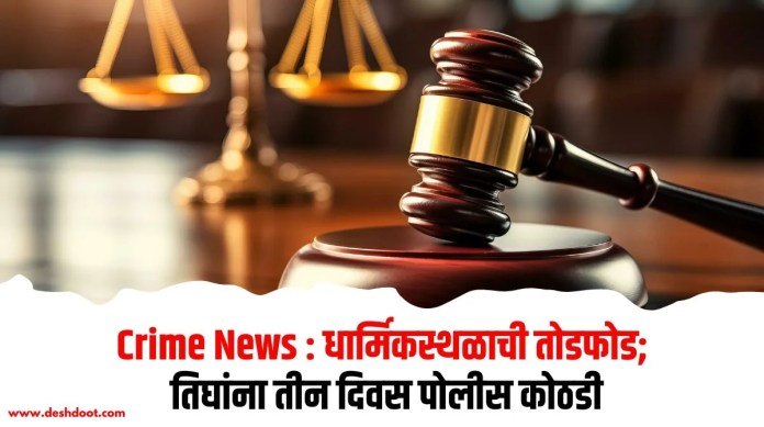शहराच्या मध्यवर्ती भागातील पटवर्धन चौकाजवळील धार्मिक स्थळी तोडफोड केल्याची घटना रविवारी (24 ऑगस्ट) पहाटे तीनच्या सुमारास घडली. यानंतर स्थानिक गुन्हे शाखेच्या पोलिसांनी दिवसभरात तिघांना ताब्यात घेत कोतवाली पोलिसांच्या ताब्यात दिले. दरम्यान, त्यांना अटक करून सोमवारी (25 ऑगस्ट) न्यायालयासमोर हजर केले असता त्यांना तीन दिवसांची (28 ऑगस्टपर्यंत) पोलीस कोठडी सुनावली आहे.