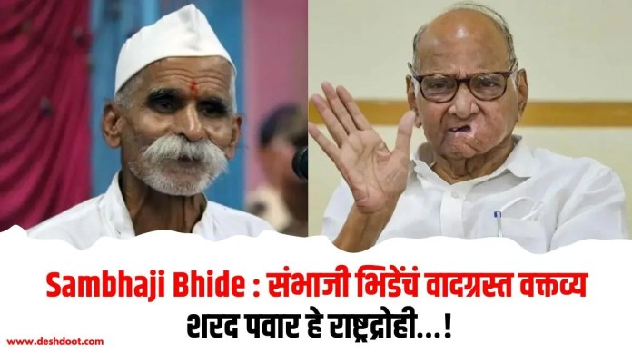 शिवप्रतिष्ठान संघटनेचे संस्थापक संभाजी भिडे (Sambhaji Bhide) हे अनेकदा वादग्रस्त विधानामुळे ते नेहमीच चर्चेत असतात. संभाजी भिडे यांची वादग्रस्त विधाने नेहमीच चर्चेत राहिली आहेत. भिडे यांनी पुन्हा एकदा राजकीय वक्तव्य केल्याने नवा वाद उद्भवला आहे. शरद पवार (Sharad Pawar) हे राष्ट्रद्रोही आहेत, असं वक्तव्य संभाजी भिडे (Sambhaji Bhide) यांनी केले आहे. तसेच शरद पवारांबद्दल आणखी आक्षेपार्ह, वादग्रस्त वक्तव्य (Controversial Statement) केल्याने त्यांच्यावर टीका (Criticism) होत आहे. राजकीय वर्तुळातून या वक्तव्यावर विविध प्रतिक्रिया येत असून सत्ताधारी पक्षाचे नेते सावध, संयमी भूमिका घेत प्रतिक्रिया देणे टाळत असल्याचे दिसून येते.
