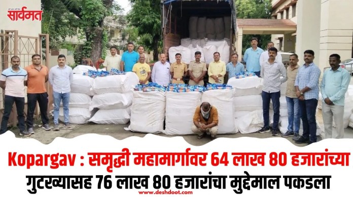 कोपरगाव शहरालगत असलेल्या समृद्धी महामार्गावरील (Samruddhi Highway) कोपरगाव-शिर्डी इंटरचेंजवर अवैध गुटखा व सुगंधी तंबाखूची (Illegal Gutkha and Tobacco) वाहतूक करणारा आयशर टेम्पो परिविक्षाधीन पोलिस उपाधीक्षक संतोष खाडे (DYSP Santosh Khade) यांच्या पथकाने मंगळवारी दुपारी पकडला. या कारवाईत 64 लाख 80 हजार रुपयांचा गुटखा व सुगंधी तंबाखूसह टेम्पो असा एकूण 76 लाख 80 हजार रुपयांचा मुद्देमाल जप्त (Seized) करण्यात आला आहे. टेम्पो चालकास पोलिसांनी ताब्यात घेतले आहे.